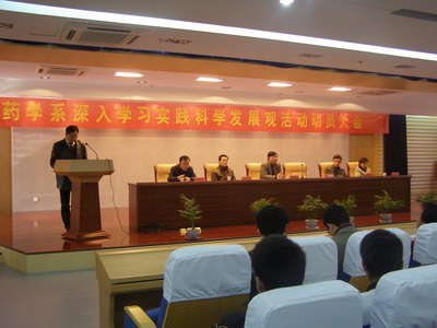 吴少云主任首先代表药学系党总支作了动员讲话。吴主任在讲话中通报了校党委召开全校深入学习实践科学发展观活动动员大会的情况。他强调,在全校深入学习实践科学发展观活动动员大会上,校党委书记卞国忠同志代表校党委作了动员讲话,并在讲话中对我校开展深入学习实践科学发展观活动的重大意义和校党委关于在全校深入开展学习实践活动的总体部署作了明确阐述,向学校各党总支和全校党员提出了开展深入学习实践科学发展观活动的具体要求。卞国忠书记还号召全校党员干部要紧紧围绕“为皖医科学发展当先锋,为高等教育强省做贡献”这个主题,贯彻落实好校党委关于在全校开展深入学习实践科学发展观活动的总体部署,推动皖医各项工作再上新台阶。为此,吴主任在讲话中表示,药学系将按照校党委的要求和统一部署,在全系掀起开展深入学习实践科学发展观活动的热潮。他代表系党总支向全系党员、入党积极分子提出了以下要求:一是要在学习实践活动中提高自己的党性修养,坚定建设中国特色社会主义的信念,增强政治敏感性,思想和行动同党中央保持高度一致;二是要通过开展深入学习实践科学发展观活动,解决自身的突出问题,教工党员要通过学习实践活动提升工作能力和业务水平,树立为人师表、爱岗敬业的良好教风,学生党员要通过学习实践活动,端正自己的学习态度,树立正确的世界观、人生观、价值观和道德观,成为建设中国特色社会主义事业的合格接班人;三是要在开展深入学习实践科学发展观活动中加强领导,明确责任。系里成立学习实践活动领导小组,下设办公室,督促检查学习实践活动的开展情况,各党支部和党小组也要建立起相应的学习小组,加强宣传,严格按照“党员干部受教育、科学发展上水平、人民群众得实惠”的总体要求,做到高度重视、精心谋划、营造氛围、务求实效。