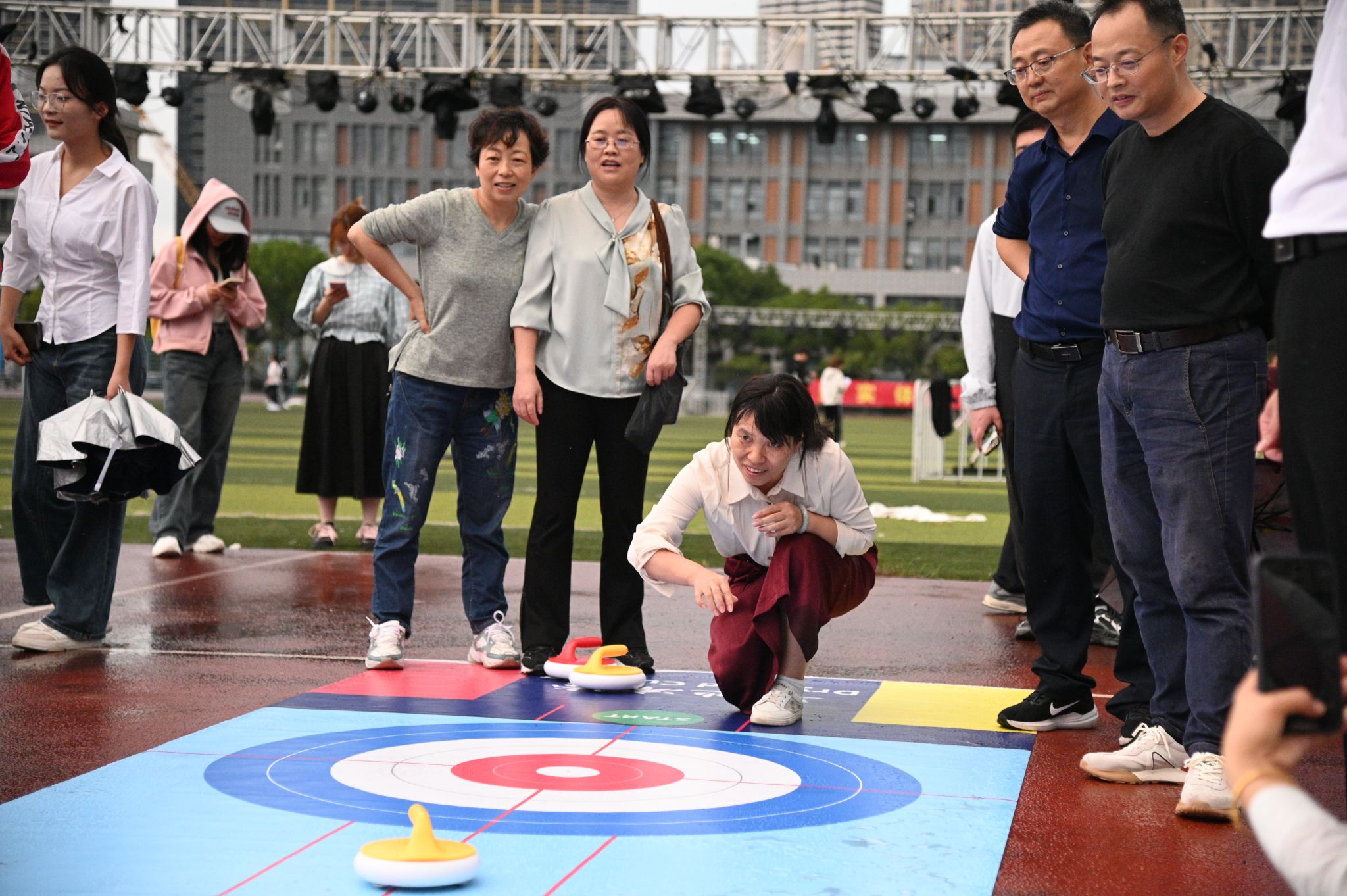 本次趣味运动会设有“勇毅前行”(螃蟹背西瓜)、“凝心聚力”(男、女混合团体拔河)两项团体项目和“锚定目标”(旱地冰壶)一项个人项目,集趣味性、协作性和竞技性于一体。本着“友谊第一,比赛第二”的精神,广大教职工充分发扬团结合作、奋勇争先的精神,此起彼伏的掌声和欢呼声充满整个赛场。在“勇毅前行”比赛中,运动员们背靠背、手挽手,默契配合、步调一致,奋力同行;在“凝心聚力”比赛中,运动员们咬紧牙关、全力以赴,展现出顽强拼搏的精神风貌;在“锚定目标”比赛中,运动员们蓄势待发、奋力一击,尽情享受运动带来的快乐。