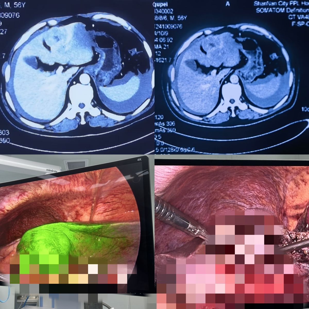 患者男性,56岁,因上腹部疼痛不适在山南市人民医院就诊,门诊彩超提示肝脏占位,腹腔积液(考虑肝ca破裂出血,出血已停止),住院后积极对症处理,完善检查肝脏肿瘤位于肝脏ⅣB段,未见肝内及远处转移。经过充分术前准备,援藏医疗专家方小三实施ICG(吲哚菁绿)荧光引导下腹腔镜肝癌切除手术,肿块完整切除,术后患者恢复良好,患者顺利出院。