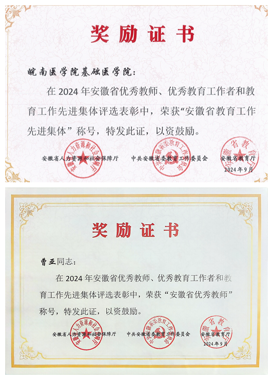“安徽省教育工作先进集体”“安徽省优秀教师”证书