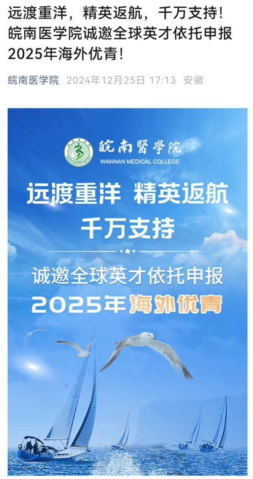 坚持多措并举,探索引进模式。利用学校公众号、第三方人才招聘网站、地方媒体广泛宣传引才政策,制作发布“远渡重洋 精英返航 千万支持 诚邀全球英才依托申报2025年海外优青”引才公告,积极与第三方中介机构合作,参加学术桥、中国博士人才网、中国教育在线等机构博士专场线上云洽会。校领导亲自带队参加清华大学、北京大学、中国人民大学、西安交通大学、首都医科大学等高校线下人才对接会,参加芜湖市紫云英人才系列活动,全年累计30余场次。