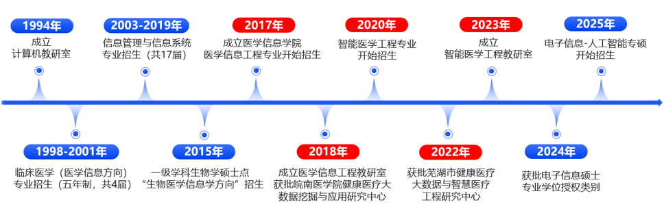 学校于1994年成立计算机教研室,2017年成立医学信息学院,1998-2001年招收4届临床医学(医学信息方向)专业学生,2003-2019年招收17届信息管理与信息系统专业学生,现有医学信息工程、智能医学工程两个本科专业和电子信息硕士专业学位授权类别,在校生1300余人。其中,智能医学工程专业为安徽省首个智能医学工程本科专业,获批省级“六卓越、一拔尖”卓越人才培养创新项目。学院现为安徽省人工智能学会智慧医疗专委会主任委员挂靠单位,有教职员工47人,其中高级职称16人、博士学位16人,安徽省教学名师1人、安徽教坛新秀1人。