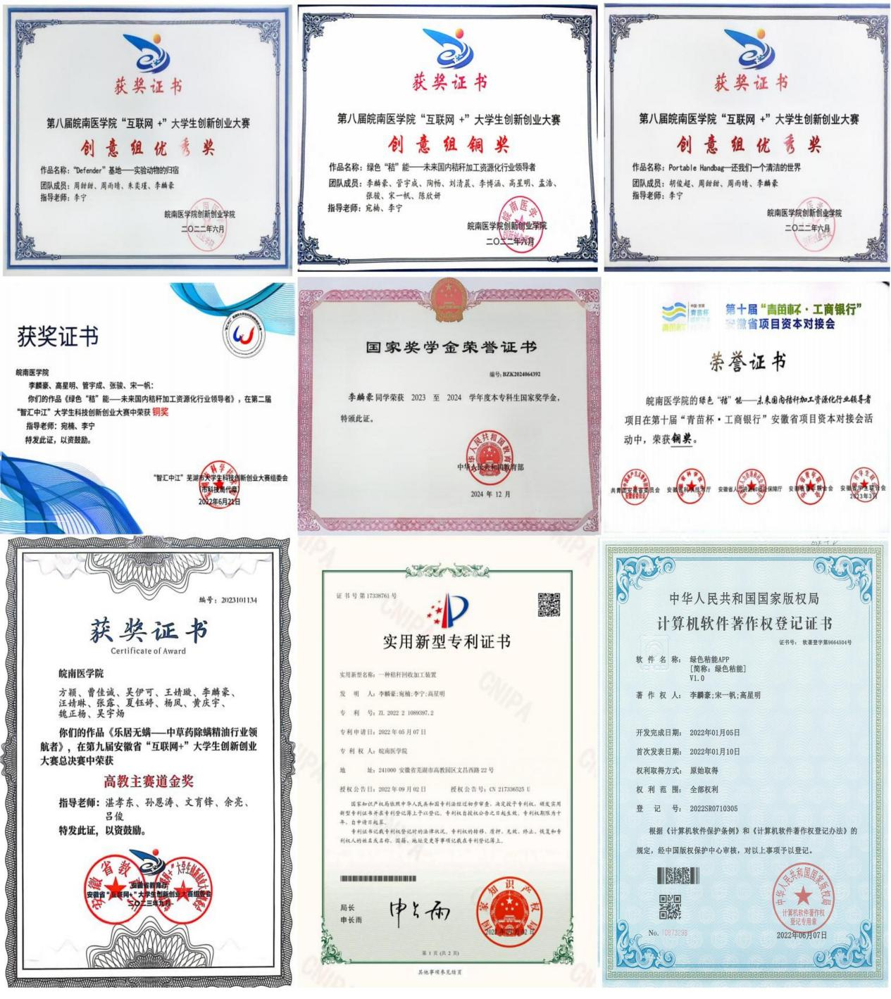 作为青年大学生,李麟豪在校期间刻苦学习,连续4年综合测评位于年级前1%,获校级各类单项奖学金共计15次,曾获2023-2024学年国家奖学金,并多次获“三好学生”、“优秀学生干部”、“优秀社长”等荣誉称号。本科求学期间,他努力提升科研素养和能力,作为项目负责人获批校大学生科研资助项目1项,授权实用新型专利1项、计算机软件著作权1项,发表论文3篇。此外,他还积极投身各类竞赛活动,曾获安徽省青苗杯铜奖、“智汇中江”芜湖市创新创业大赛铜奖及校级简历设计大赛二等奖等20余奖项。