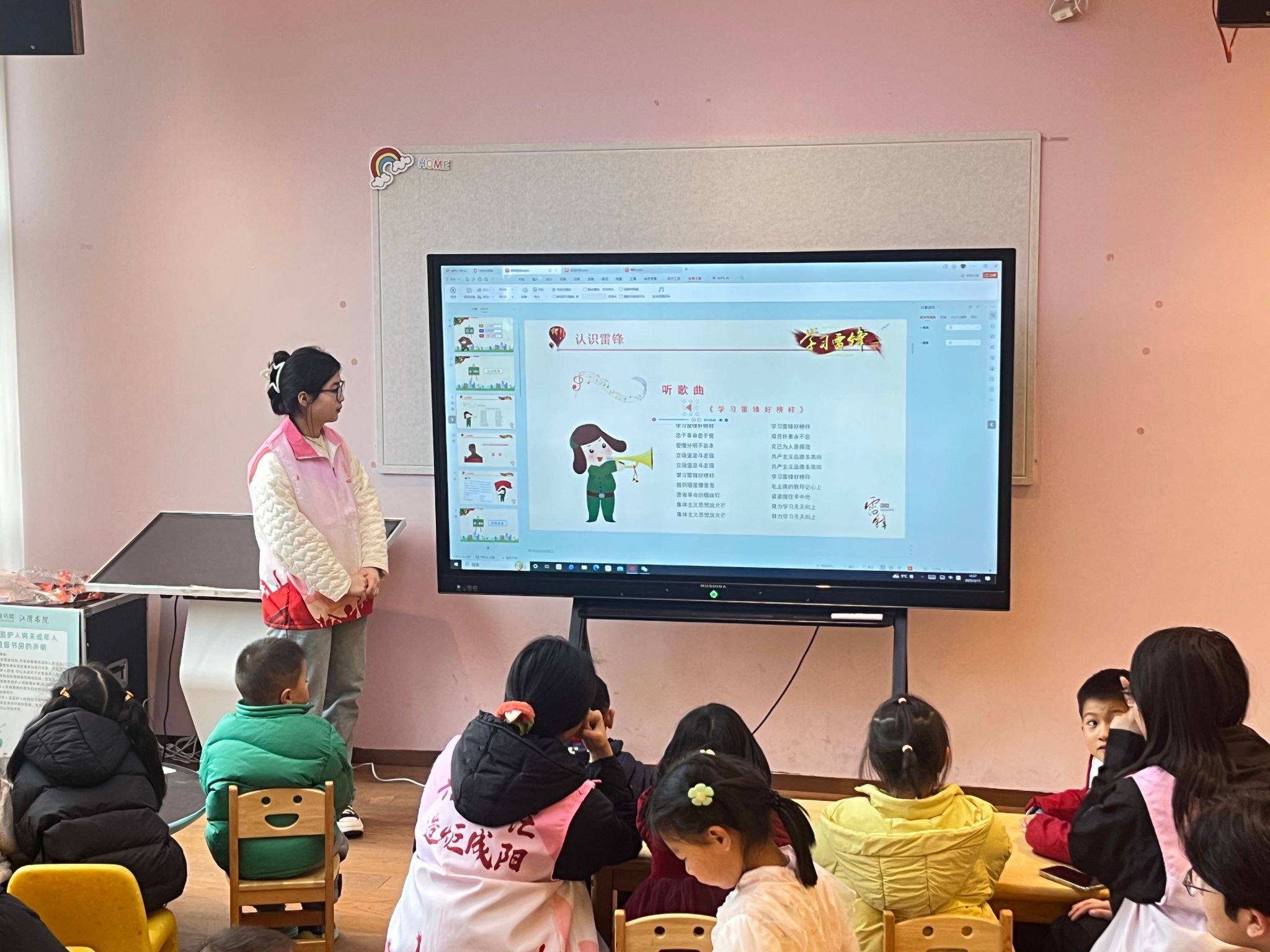 活动伊始,主持人通过雷锋精神主题课件,向小朋友们生动讲述了雷锋的生平事迹和感人故事,深入浅出地阐释了雷锋精神的时代内涵。同学们还推荐与雷锋、雷锋精神有关的书籍、电影和歌曲,希望借助丰富多彩的形式加深小朋友们对雷锋的了解,帮助他们用心感受雷锋精神的温度,让雷锋精神在小朋友们的心中埋下种子。