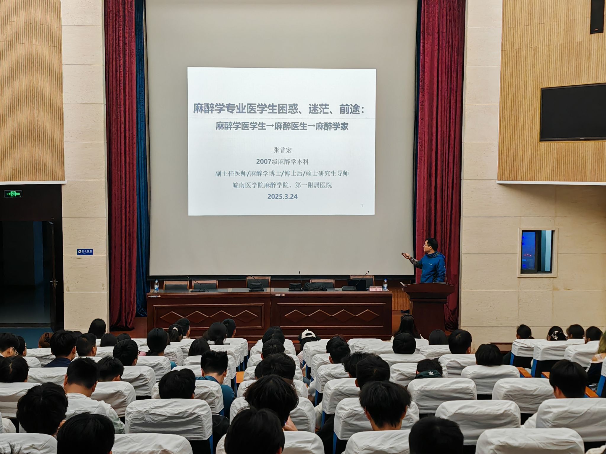 讲座中,张普宏以"麻醉学专业医学生困惑、迷茫、前途:麻醉学医学生→麻醉医生→麻醉学家"为主题,结合自身从本科到博士后的成长经历,系统阐述了麻醉学的学科价值与发展前景。他通过详实的数据和生动案例,深入分析了当前麻醉学专业面临的执业医师考试通过率、考研深造率及就业质量等现实挑战,特别强调麻醉医生在临床麻醉、疼痛诊疗和危重症救治领域的核心地位。此外,他还以麻醉学专业发展历程为切入点,结合黄宇光、姚尚龙等杰出校友的成长轨迹,激励学弟学妹树立"攀登医学高峰"的职业理想。他重点解析了医学人才培养体系,详细介绍了从住院医师到主任医师的晋升路径,强调临床能力、科研素养与人文精神并重的"六边形战士"培养目标。在问答环节,面对同学们的提问,张普宏鼓励学生以"终身学习"应对行业挑战,建议低年级学生筑牢专业基础,高年级学生根据兴趣选择学术型或临床型发展路径。到场同学纷纷表示将以优秀校友为榜样,在医学道路上踔厉奋发、勇毅前行。