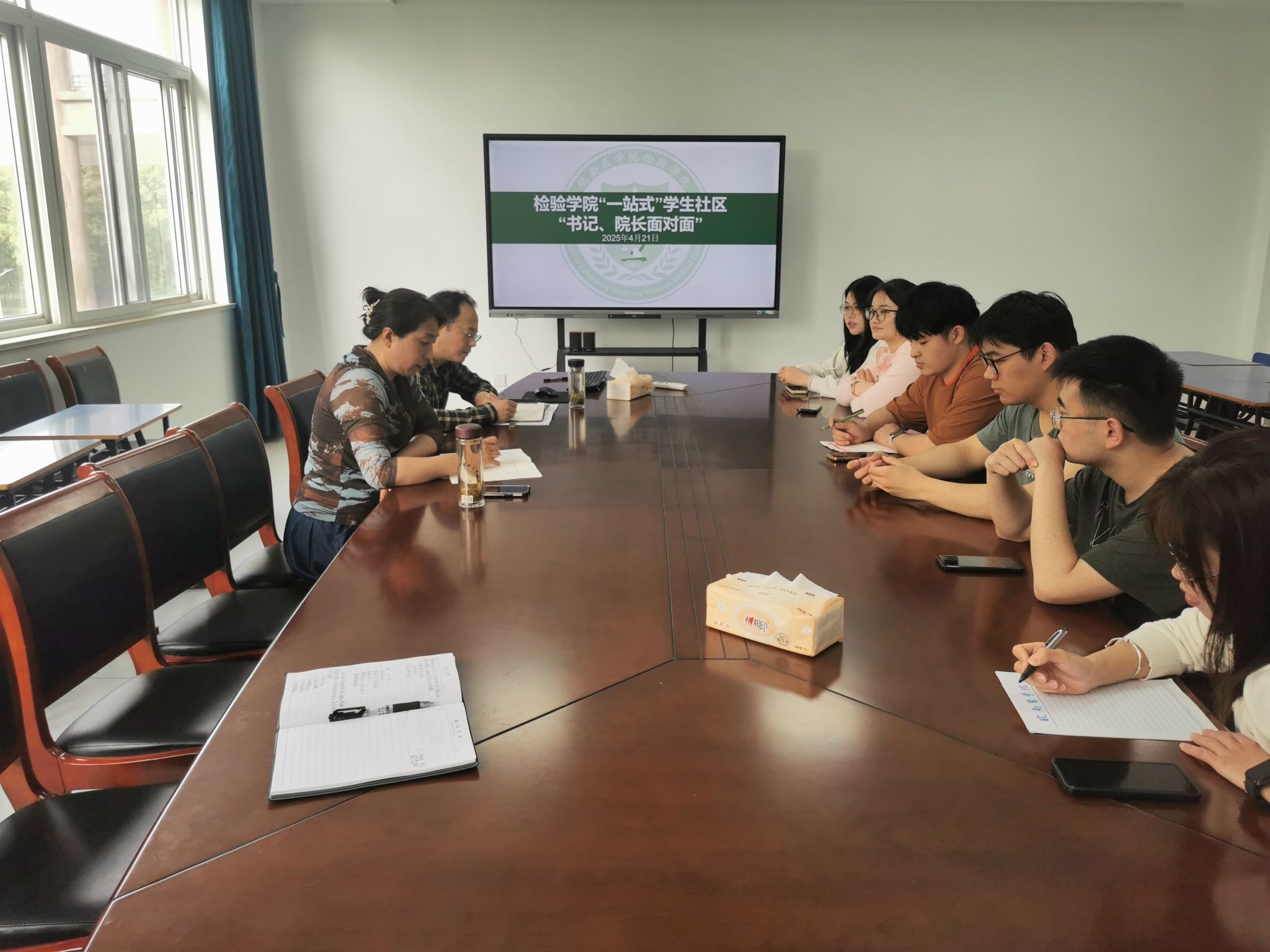 为切实落实“以生为本”的育人理念,精准对接学生成长需求,扎实开展深入贯彻中央八项规定精神学习教育,进一步提升学生管理与服务水平,4月21日下午,检验学院举办“一站式”学生社区“书记院长面对面”活动。检验学院党委书记、5号公寓“一站式”学生社区楼长刘影,院长洪亮,5号公寓“一站式”学生社区联络员曹玉祥,以及6名学生代表齐聚一堂,共话成长发展。活动由刘影主持。