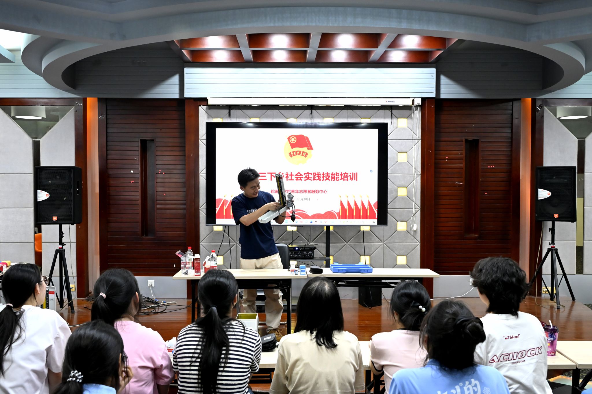 6月底,实践团成员们在期末考试后便立即投入到紧张的筹备工作中,从场地协调、物资采买到宣传策划、安全教育,全体成员全力以赴、热情高涨。为提升团队医疗服务能力,特邀护理学院老师为团队成员做义诊技能培训。队员们开展“杏林小讲堂”集体备课,就团体心理辅导、医学科普等主要课程内容进行多次讨论、备课与试讲。6月27日下午,校团委召开行前动员会,重点强调了组织纪律与安全保障,并对活动开展提出希望要求,确保本次“三下乡”社会实践活动安全有序开展。