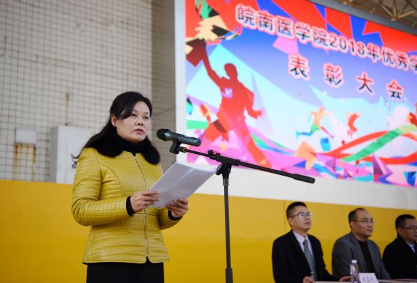 副院长郑兰荣宣读2017-2018学年度本专科生、研究生国家奖学金,2017-2018学年度本专科生国家励志奖学金,2017-2018学年本专科生学校奖学金、研究生学业奖学金、三好学生标兵、三好学生、优秀学生干部,2017年度“优良学风班”、“优秀学子”,以及学生通报表扬的表彰文件。