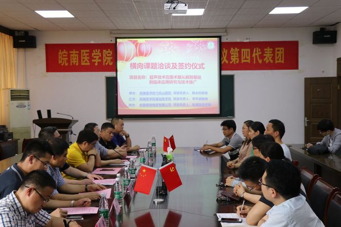 基础医学院项目负责人李怀斌教授首先介绍了学校横向课题立项政策等情况;弋矶山医院项目负责人陈永权教授介绍本横向课题的立项思路和拟开展的具体情况;安徽昊特商贸有限公司项目负责人赵德田总经理介绍了现代医疗设备更新对医学基础与临床验证的需求情况,希望通过本课题的开展,进一步推进产、学、研的综合运用。随后,三方共同签署了《超声技术在围手术期从解剖基础到临床应用研究与技术推广横向课题协议书》。